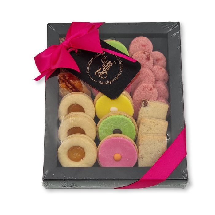 Zutaten: WEIZENMEHL, Zucker, BUTTER, Gelée(Aprikosenmark,Zitronenkonzentrat), Himbeermark, Passionsfruchtmark, Dextrose, Geliermittel(E440), Säuerungsmittel(E330,E331,E333), Konservierungsmittel(E202), MANDELN, VOLLEI, DINKELMEHL, MAISSTÄRKE, WEIZENSTÄRKE, Kartoffelstärke, pflanz.Fettegehärtet, Glukosesirup, MAGERMILCHPULVER, Kakaopulver, Schokolade(EmulgatorE322), MILCHSCHOKOLADE(Emulgator(E322), HASELNÜSSE, SOJAMEHL, Kakaomasse, Kokosöl, Gummiarabicum, Illipebutter, Sheabutter, Himbeerbackmarmelade, Sorbit(E420), Sonnenblumenöl, Honig, Guarkernmehl(E412), Hartschalenobst Apfel(PektinE449), Zitronensaft, Orangensaft, Salz, Zitronenschale, Gelier- und Verdickungsmittel(E413,E414), Emulgatoren(E473,E475), Feuchthaltemittel(E422), Konservierungsmittel(E200,E202), Antioxydant(E300), Stabilisator(E450), Xanthan(E415), Natriumcitrat(E331), Vanillin, Aromen, Kaliumcarbonat(E501), Farbstoffe(E101,E104,Beta Carotin,E131,E160a,E150d,E124) AllergikerInfo: WEIZEN, EIER, MANDELN, HASELNÜSSE, ERDNUSS, SOJA, MILCH, DINKEL, MAIS, HARTSCHALENOBST